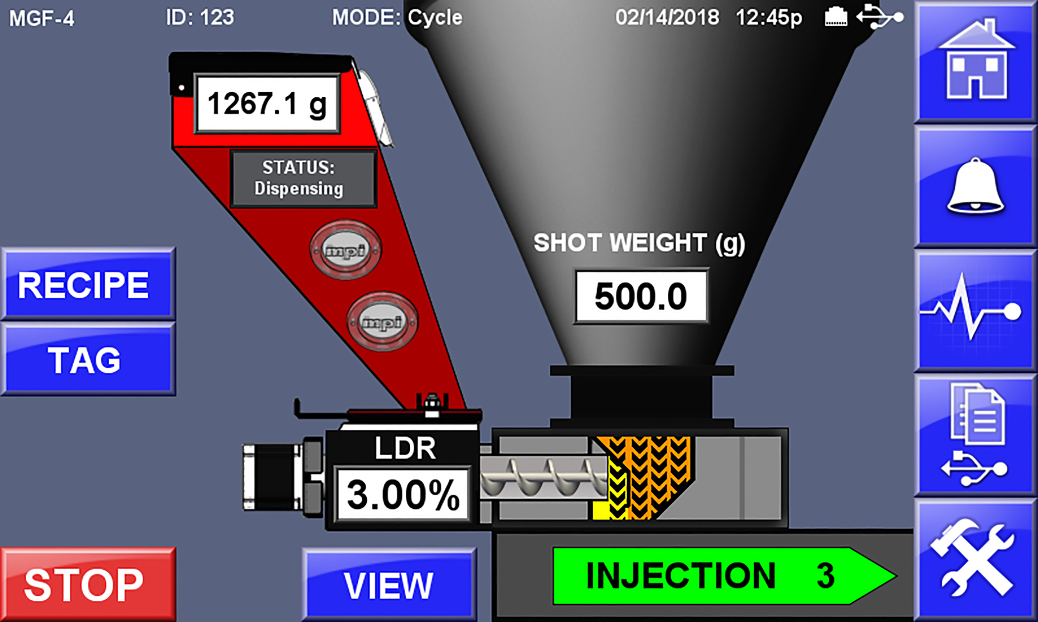 ????????與傳統(tǒng)喂料不同的是這種正在申請(qǐng)專利的控制系統(tǒng)可以在注塑階段同時(shí)計(jì)量加入色母,這使色母分散更均勻并節(jié)省成本。美鍇產(chǎn)品有限公司 (Maguire Products, Inc.) 在 K-2019 展上作為 MGF?重力喂料機(jī)的新功能介紹了該技術(shù)。在注塑成型周期中,大約 75% 的原料在回退階段進(jìn)入螺桿,大約 25% 在注塑期間進(jìn)入螺桿。由于傳統(tǒng)喂料機(jī)僅在回退過程中添加色母,因此可能會(huì)發(fā)生混合不足。當(dāng)注射量接近螺桿容量或最終產(chǎn)品為半透明時(shí),這尤其是個(gè)問題。在新的 100% Injection Coloring系統(tǒng)中,MGF?喂料機(jī)上的專用控制器在兩個(gè)階段都接收來自成型機(jī)的信號(hào),從而確保在整個(gè)周期中都添加色母。