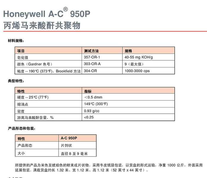 • 霍尼韋爾 honeywell 丙烯馬來酸酐共聚物 A-C 950P 適用熱熔膠電纜塑料改性 物性表, 霍尼韋爾 honeywell 丙烯馬來酸酐共聚物 A-C 950P 適用熱熔膠電纜塑料改性 產(chǎn)品參數(shù),霍尼韋爾 honeywell 丙烯馬來酸酐共聚物 A-C 950P 適用熱熔膠電纜塑料改性 性能表,霍尼韋爾 honeywell 丙烯馬來酸酐共聚物 A-C 950P 適用熱熔膠電纜塑料改性 出廠報告, MSDS,, 物質(zhì)安全資料表, UL黃卡,{ SGS報告, RoHS, 食品級認(rèn)證, NSF飲用水標(biāo)準(zhǔn), 產(chǎn)品資料, 產(chǎn)品性能, 出廠報告, 原廠原包, 代理商, 熱變形溫度, 熔指數(shù), 流動系數(shù), 抗沖擊性能、沖擊強度, 低溫韌性、低溫抗沖擊性能, 熔體流動系數(shù)、熔體流動速率, 加工工藝、加工參數(shù)、加工溫度, 歐盟RoHS 德國FDA 美國FDA 日本FDA