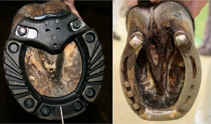 在測試傳統的鋼鞋時,兩匹馬的腳趾抓扣和別針已安裝,而兩匹馬的腳趾區域只有別針而沒有腳趾抓扣。