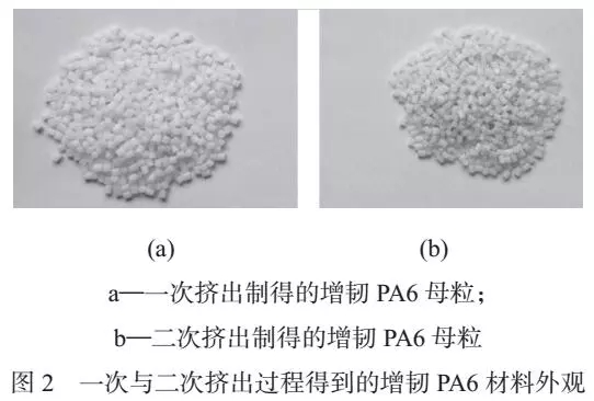 ????????在二次擠出過程中雖然加入了與一次過程等量的抗氧劑,但是增韌PA6 材料仍然發生了明顯的氧化現象,一次與二次擠出過程得到的增韌PA6 材料外觀如圖2 所示。從圖2 可以看到,二次擠出過程得到的增韌PA6 顆粒顏色明顯比一次擠出過程顆粒顏色深,說明二次擠出過程增韌PA6 材料發生了更多的氧化降解,因此二次擠出過程中得到的增韌PA6材料的拉伸強度更低。
