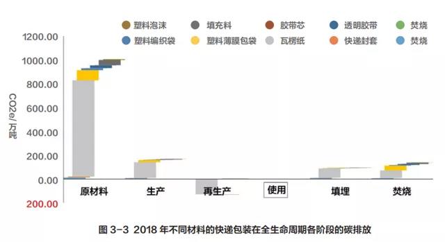 從圖 3-2 和圖 3-3 中可知,在 2018 年我國快遞包裝材料在生命周期各階段中(不包括再生),原材料階段(71.56%)的碳排放所占比重大,處置階段占比重較小(焚燒 9.79%,填埋6.68%),生產階段(11.97%)占比小。