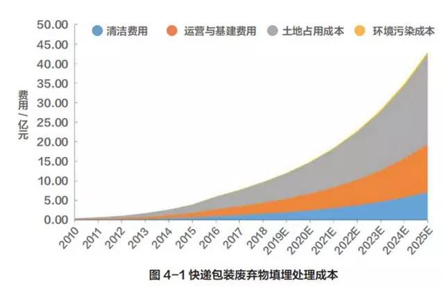用此方法估算,平均每噸快遞垃圾填埋所需的處理費用為 705 元,其中填埋場占用土地產生的成本較大。以2018 年為例,填埋 138.13 萬噸快遞垃圾需垃圾處理費用 9.74 億元,其中土地占用成本 5.22 億元、運營與基建費用 2.79 億元、清運費用 1.61 億元,環境污染成本 1265 萬元。若不采取有效的措施,至 2025 年我國填埋快遞包裝將達到 608.71 萬噸,處理費用達 42.92 億元;