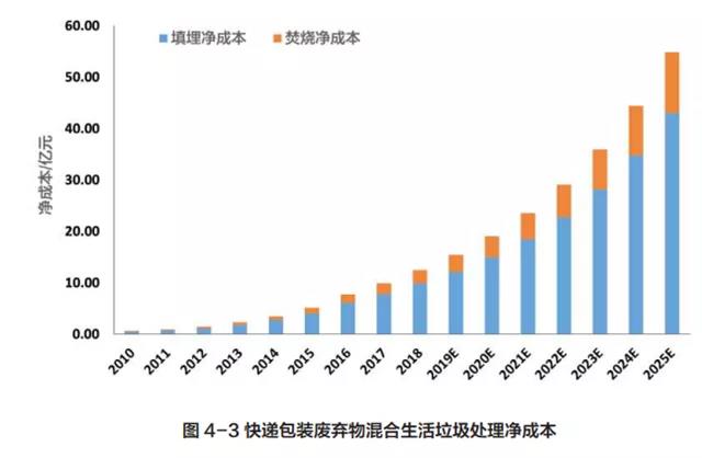 平均焚燒 1 噸快遞垃圾所需費用 511 元,根據住建部發布的《中國城市建設統計年鑒》,2016 年我國生活垃圾填埋比例高達 60%,而焚燒比例為 38%,依此比例推算,2018 年快遞包裝焚燒量為 81.27 萬噸,處理費用也增至 4.15 億元。雖然生活垃圾焚燒發電產生了部分經濟效益,但效益遠低于成本。2018 年垃圾焚燒效益雖達到 1.46 億元,但凈成本也增長到了 2.69 億。