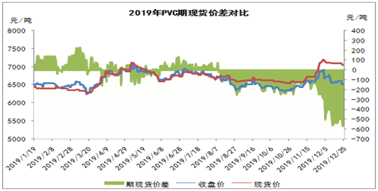 近日,受市場(chǎng)供應(yīng)面有一定提升以及下游接貨不佳影響,PVC行情轉(zhuǎn)入跌勢(shì)。PVC期貨偏弱震蕩,對(duì)現(xiàn)貨市場(chǎng)價(jià)格形成一定打壓,市場(chǎng)價(jià)格承壓下跌。此外,期現(xiàn)貨價(jià)差再創(chuàng)新高,最高達(dá)570元/噸左右。由上圖可以看出,進(jìn)入2019年四季度,PVC期限價(jià)差逐漸擴(kuò)大,基本維持在500-600元/噸之間,而期貨價(jià)格遠(yuǎn)遠(yuǎn)低于現(xiàn)貨價(jià)格,超出正常范圍。因此單從期現(xiàn)價(jià)差方面看,后期將逐漸修復(fù)步入正軌,現(xiàn)貨大幅下降的可能性偏大。