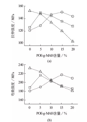 ????????目前,增韌劑對玻纖增強(qiáng)的高溫尼龍材料的研究報(bào)道較少,基于此,固定玻纖的質(zhì)量分?jǐn)?shù)為20%,采用雙螺桿擠出機(jī)制備基于PA6T/66及PA10T的POE-g-MAH增韌高溫尼龍材料和POE-g-MAH增韌PA66材料,研究了增韌劑POE-g-MAH對高溫尼龍復(fù)合材料的力學(xué)性能的影響,探索增韌劑改善高溫尼龍玻纖增強(qiáng)復(fù)合材料的可能機(jī)理。