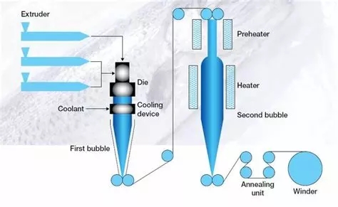 ????????三泡法熱收縮袋生產工藝及原理。其三泡法工藝流程一般如下: