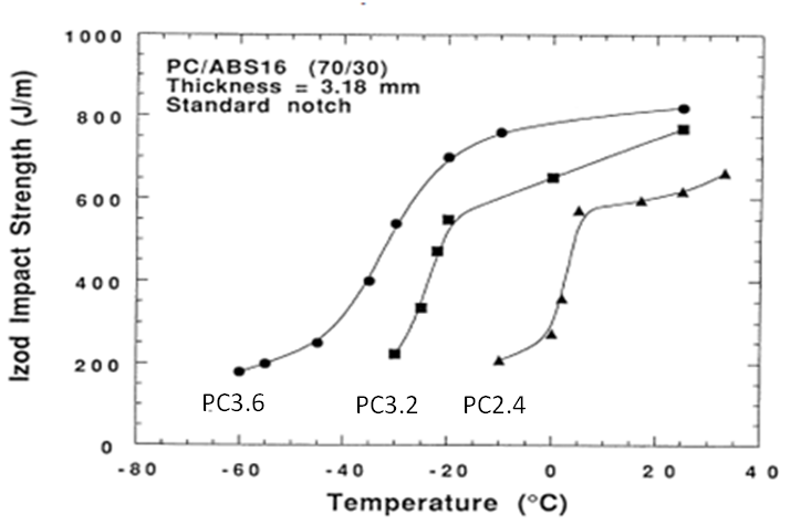 ????????那么,不同分子量的PC對PC/ABS合金的沖擊強度和低溫韌性有什么樣的影響呢?將各分子量PC與膠含量為16%的ABS以70/30的比例共混制得合金,其3.18mm缺口沖擊性能。