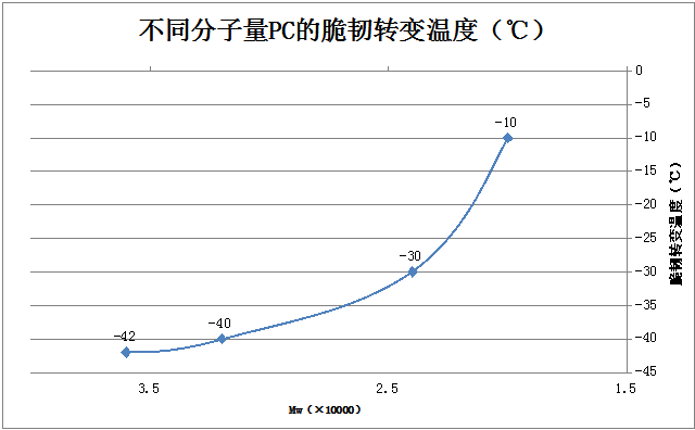 ????????對于有低溫韌性要求的材料來說,脆韌轉變溫度是一個重要參數,PC分子量對其脆韌轉變溫度有重要影響。在PC分子量較高時,其脆韌轉變溫度隨分子量下降而升高并不明顯,如PC分子量由3.6萬下降到3.2萬時,其轉變溫度由-42℃只提升了2℃到-40℃;而PC分子量下降到中等分子量以下(≤2.4萬)時,其脆韌轉變溫度快速上升,由PC2.4的-30℃上升20℃到PC2.0的-10℃??梢姡胫苽涞蜏仨g性較好的PC,保持PC較高的分子量是很有必要的。