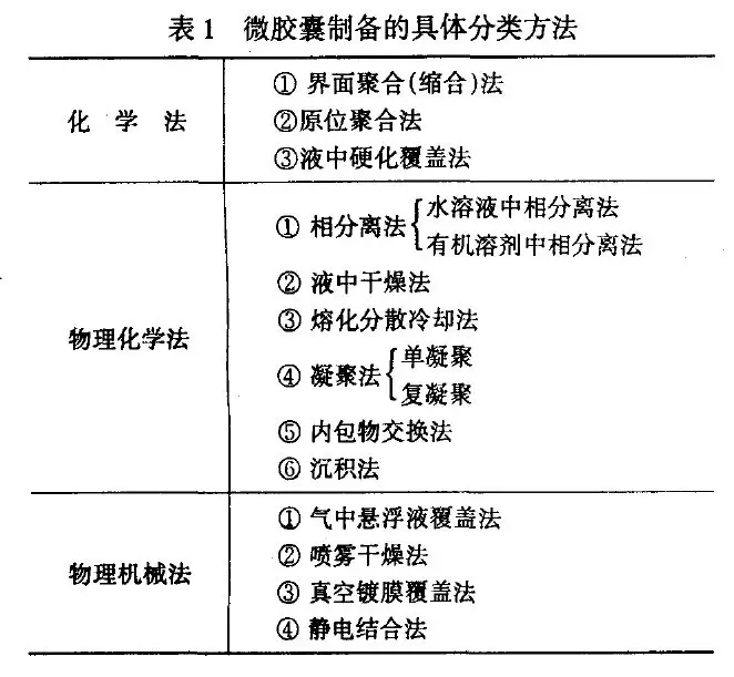????????微膠囊的制備方法有很多種,通常分為化學(xué)法、物理化學(xué)法和物理機械法三種,表1中列出了常見的制備方法。