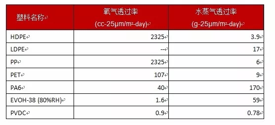 ????????塑料的阻隔性是指塑料包裝材料或容器防止小分子氣體,如氧氣、二氧化碳、氮氣、水蒸氣、香味及其他有機(jī)溶劑蒸汽等透過的能力。用于表征塑料阻隔能力大小的指標(biāo)為透過率,即一定厚度的塑料制品在一定壓力、溫度和濕度條件下,單位時間和單位面積內(nèi)透過小分子物質(zhì)的體積或重量。塑料的透過率越小,說明其阻隔能力越高。下表給出了一些常用塑料的透氣、透濕率: