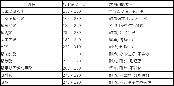 ????????從表中可以看出,聚酰胺的加工溫度很高,所用的著色劑需要有很高的耐熱性,就塑料用有機顏料而言, 除了對其熱穩定性有一定要求外, 還需要有較好的耐曬牢度。不少有機顏料對聚酰胺熔融物的性能會產生明顯的負作用,因此用于聚酰胺著色的有機顏料有一定限制。