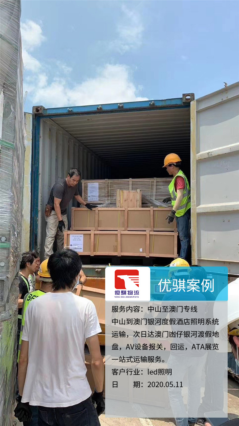 業務內容:中山到澳門銀河度假酒店照明系統運輸,次日達澳門凼仔銀河渡假地盤,AV設備報關,回運,ATA展覽一站式運輸服務??蛻粜袠I:LED照明客戶來源:老客戶介紹自從我們中山優騏物流開通了中山至澳門的物流專線以后,很多原來物流的同行都介紹業務過來。這個客戶是從中山發燈具到澳門,整個AV設備報關,回運,ATA展覽都是我們完成,獲得了客戶的一致好評,期待下一次的合作。